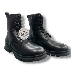 Bota estilo militar track en piel con plataforma doble goma antideslizante. Cierre acordonado y cremallera en lado interno.