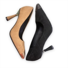 Zapato de fiesta con tacón chupete combinando con el color dorado en tacón y punta. Fabricado en piel de antelina.