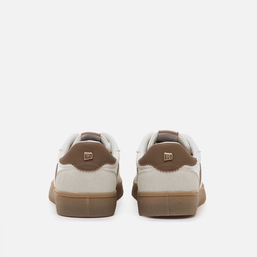 Zapatillas de color blanco con detalles gris y marrón para mujer, modelo Roy de Mustang. Su diseño combina una base clara con contraste en el talón y bandas laterales, aportando un aire retro muy versátil. La suela de goma en color caramelo ofrece buen agarre y un acabado clásico, ideal para el uso diario. Con bordado del logo lateral y una silueta inspirada en el calzado deportivo vintage, este modelo es perfecto para looks relajados con un toque actual.