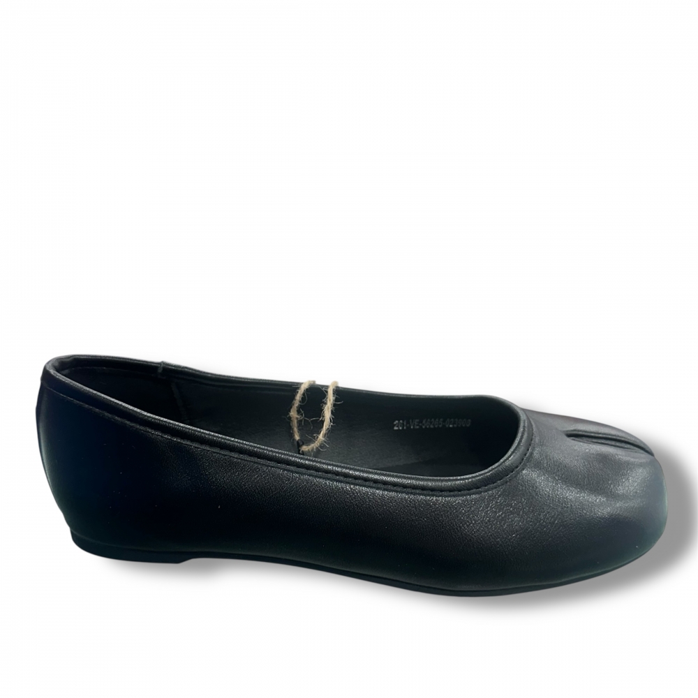 Bailarina plana con puntera tipo tabi de la marca Mustang, modelo Tabatha de color negro para mujer. Este diseño incorpora una ligera separación frontal de los dedos, junto a una suela fina que aporta comodidad. Su acabado liso se completa con el logo metálico trasero, encajando fácilmente en looks urbanos o más formales. Con certificado VEGANO sellado por INESCOP, el cual garantiza que la naturaleza química principal del material no se corresponde con fibras de origen animal.
