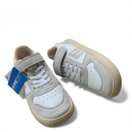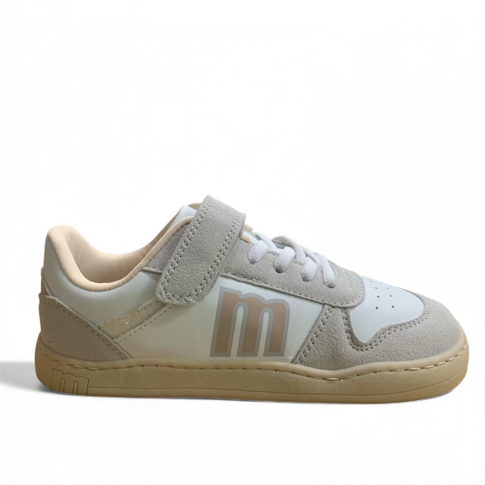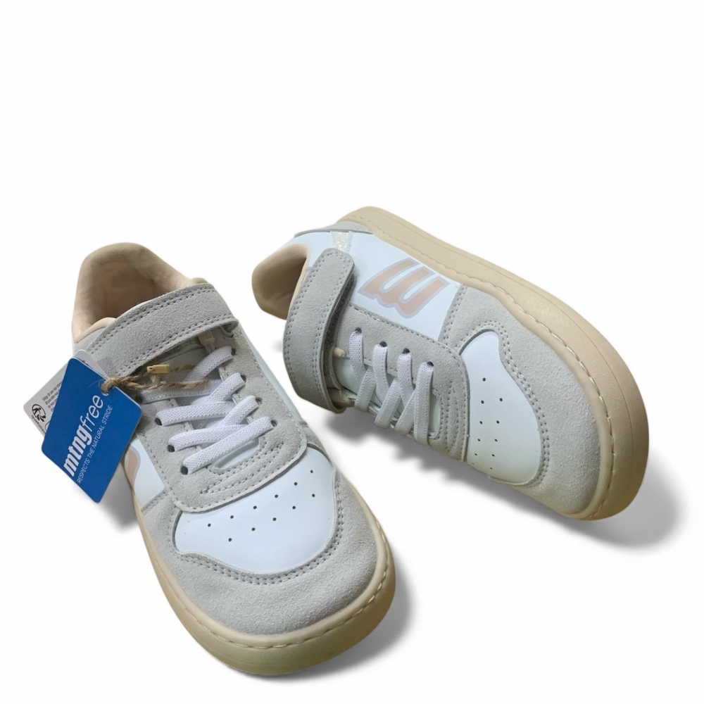 Zapatillas de color blanco con detalles en beige y rosa para niña de la marca Mustang, modelo Free. Diseñadas para ofrecer comodidad y estilo con su cierre combinado adhesivo y cordones elásticos, estas zapatillas destacan por su ajuste práctico y su diseño reforzado en la puntera y los laterales. La combinación de colores suaves les da un toque versátil. Diseñada y desarrollada especialmente en colaboración con el Dr. Juanjo López, traumatólogo deportivo e infantil, para respetar el desarrollo natural del pie de los niños. Gracias a su puntera ancha permite el libre movimiento de los dedos dentro del zapato. Su suela tiene 3 mm de grosor y con zero drop (totalmente plana) respeta el natural desarrollo del pie del pequeño y sus elementos flexibles y torsionables hace que el pie del niño no esté encorsetado por la estructura del zapato. Las plantillas extraíbles y las marcas de los dedos en la misma, facilita comprobar si la talla del calzado es la correcta para tu hijo. Además, su fácil apertura facilita que el niño pueda descalzarse y calzarse de forma autónoma. Acompaña los primeros pasos de tu bebé con Mustang. Con certificado VEGANO sellado por INESCOP, el cual garantiza que la naturaleza química principal del material no se corresponde con fibras de origen animal.