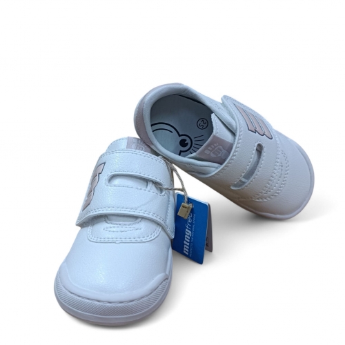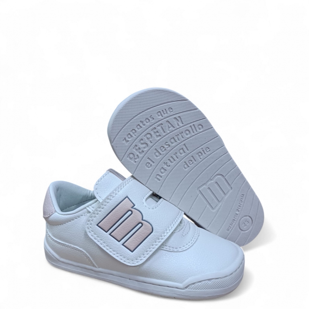 Zapatillas deportivas de color blanco para bebé de la marca Mustang, modelo Free Baby, con detalles en rosa y diseño casual. Incluyen doble cierre adherente que facilita el calce y ajuste, mientras que la “m” lateral en rosa claro aporta un detalle moderno. El talón y la lengüeta también en rosa contrastan de forma sutil con el blanco del conjunto. Además, es un modelo lavable para facilitar su mantenimiento diario. Con certificado VEGANO sellado por INESCOP, el cual garantiza que la naturaleza química principal del material no se corresponde con fibras de origen animal. Diseñada y desarrollada especialmente en colaboración con el Dr. Juanjo López, traumatólogo deportivo e infantil, para respetar el desarrollo natural del pie de los niños. Gracias a su puntera ancha permite el libre movimiento de los dedos dentro del zapato. Su suela tiene 3 mm de grosor y con zero drop (totalmente plana) respeta el natural desarrollo del pie del pequeño y sus elementos flexibles y torsionables hace que el pie del niño no esté encorsetado por la estructura del zapato. Las plantillas extraíbles facilitan comprobar si la talla del calzado es la correcta para tu hijo. Además, su fácil apertura facilita que el niño pueda descalzarse y calzarse de forma autónoma. Acompaña los primeros pasos de tu bebé con Mustang.