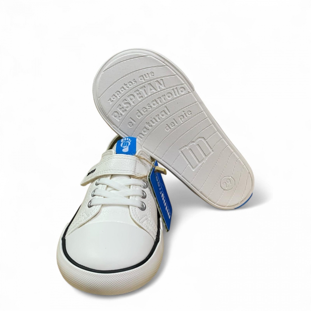 Zapatilla de color blanco para niño modelo Free de Mustang. Su estilo casual y su sistema de cierre adhesivo con cordones elásticos facilita el calce autónomo. El diseño tipo polipiel con suela de goma aporta un estilo urbano y versátil, fácil de combinar con cualquier conjunto. Diseñado y desarrollado especialmente en colaboración con el Dr. Juanjo López, traumatólogo deportivo e infantil, para respetar el desarrollo natural del pie del niño y la niña. Gracias a su puntera ancha permite el libre movimiento de los dedos dentro del zapato. Las plantillas extraíbles facilitan comprobar si la talla del calzado es la correcta para tu hijo. Además, su fácil apertura facilita que el niño pueda descalzarse y calzarse de forma autónoma. Con certificado VEGANO sellado por INESCOP, el cual garantiza que la naturaleza química principal del material no se corresponde con fibras de origen animal.