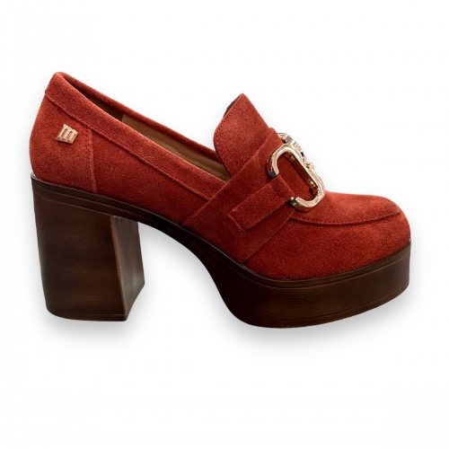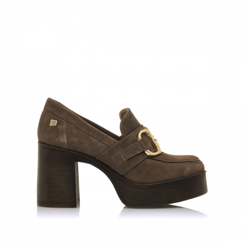 Zapato de tacón Sixties Mustang para mujer, con diseño en piel serraje de color taupe de estilo mocasín, plataforma efecto madera y detalle de aplique en la pala. Será tu nuevo básico favorito para realzar cualquier look, ir a la oficina o tomar algo con tus amigas.