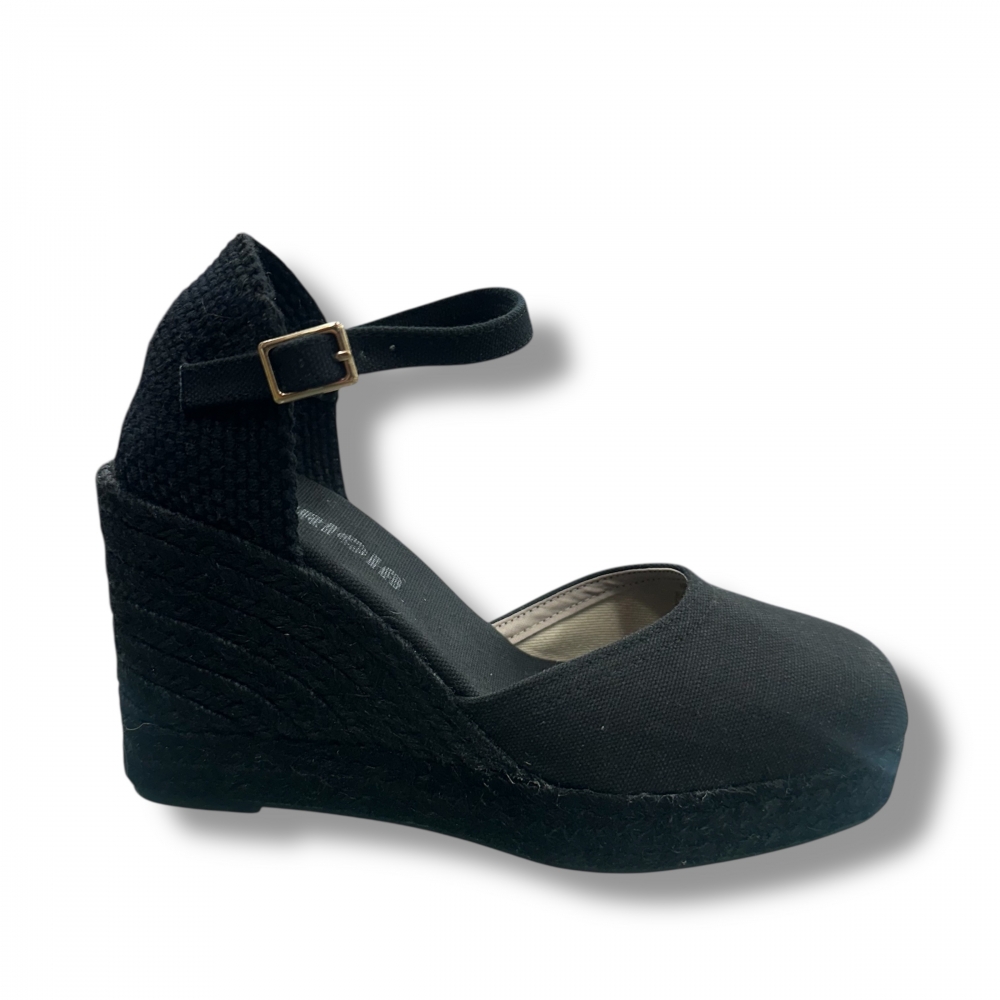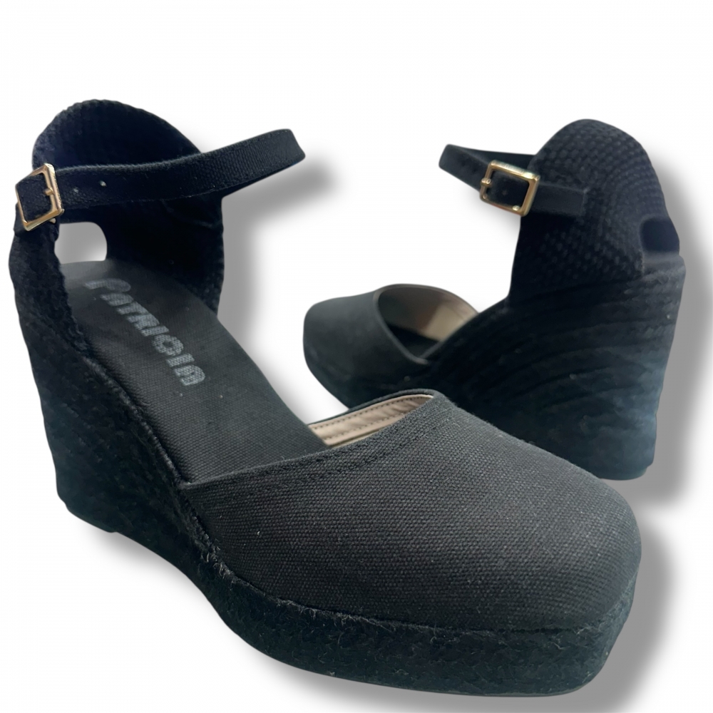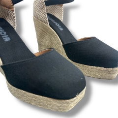 Alpargata esparto negra entera con una altura de 9,5 cm.
