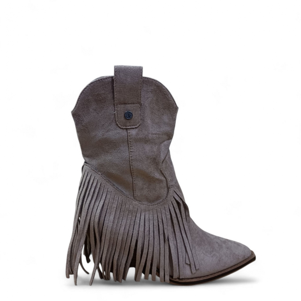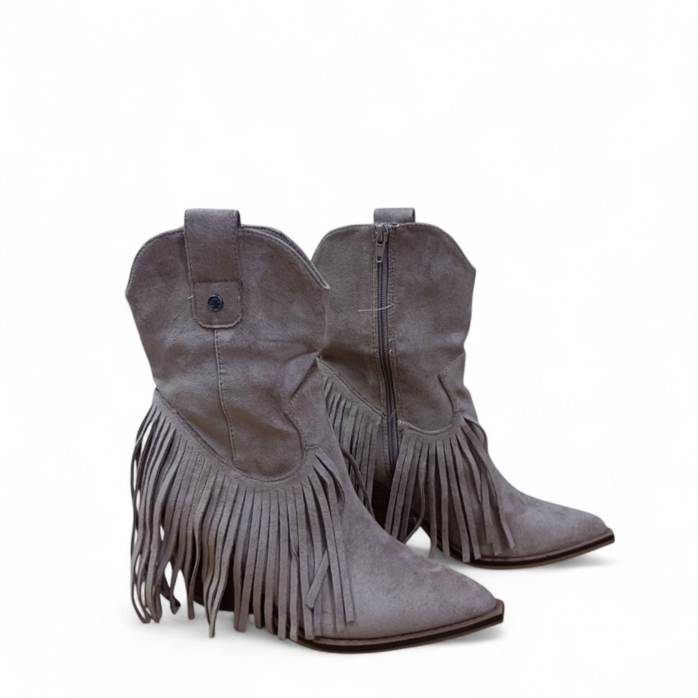 Botín de tacón estilo cowboy con flecos.