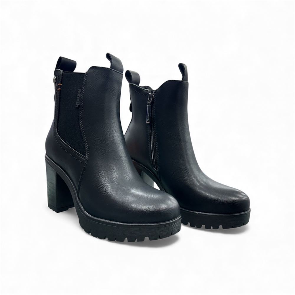 Botín de mujer, de la marca Refresh. Fabricado en un material que imita la piel. Cierre mediante cremallera interior. Modelo tipo Chelsea con elástico lateral y tirador trasero para facilitar la puesta. Tacón ancho de 9 cm con suela de goma antideslizante. Tirador trasero para facilitar la puesta. Con plantilla extraíble. Este modelo ha obtenido el certificado vegano por la organización mundial PETA (Organización de los derechos de los animales).