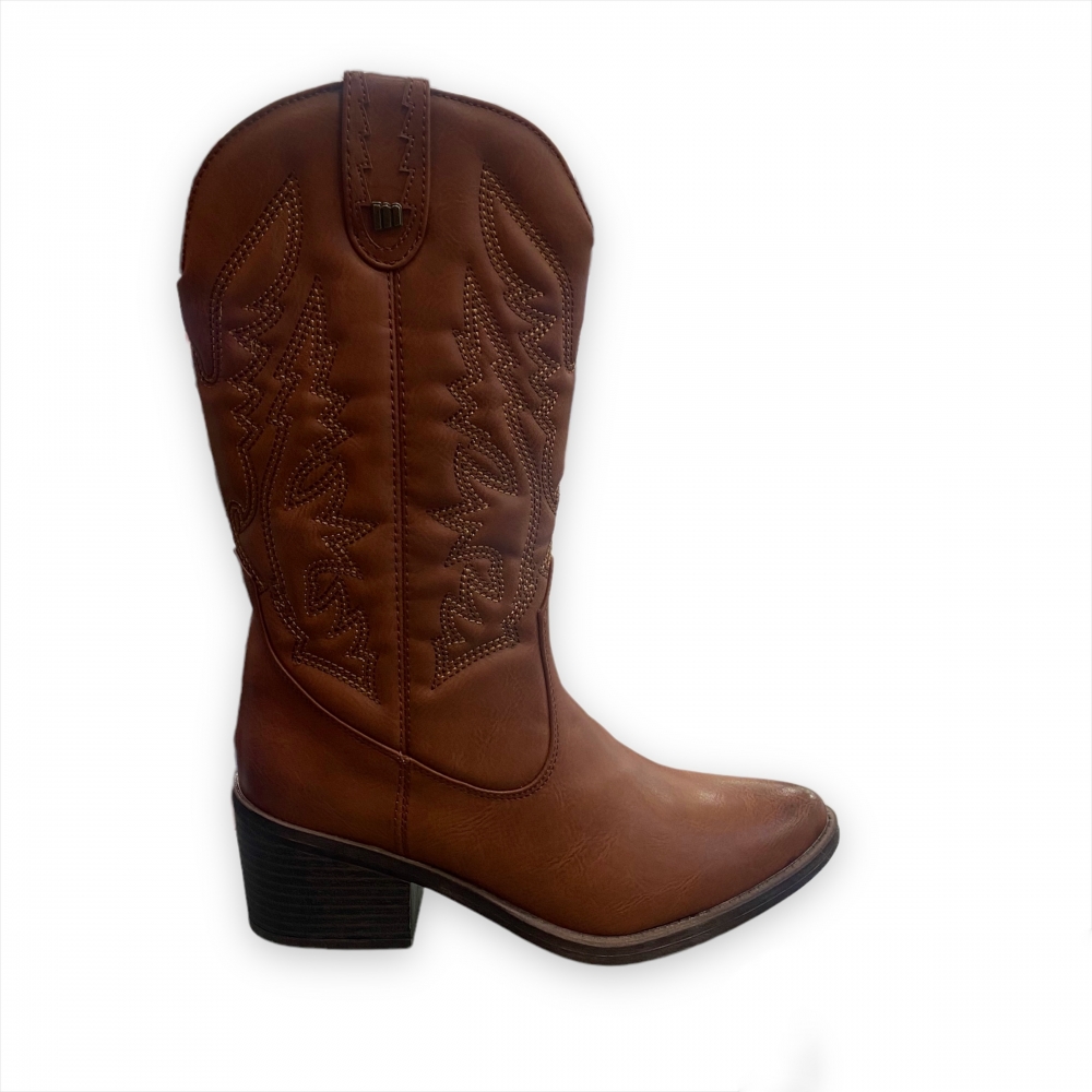 Bota Tanubis de estilo cowboy Mustang de color cuero con diseño de bordados en la caña con tacón de 5 centímetros. Tiene puntera en punta fina levantada para mejorar la pisada. Ideales para combinar con tus looks más boho.