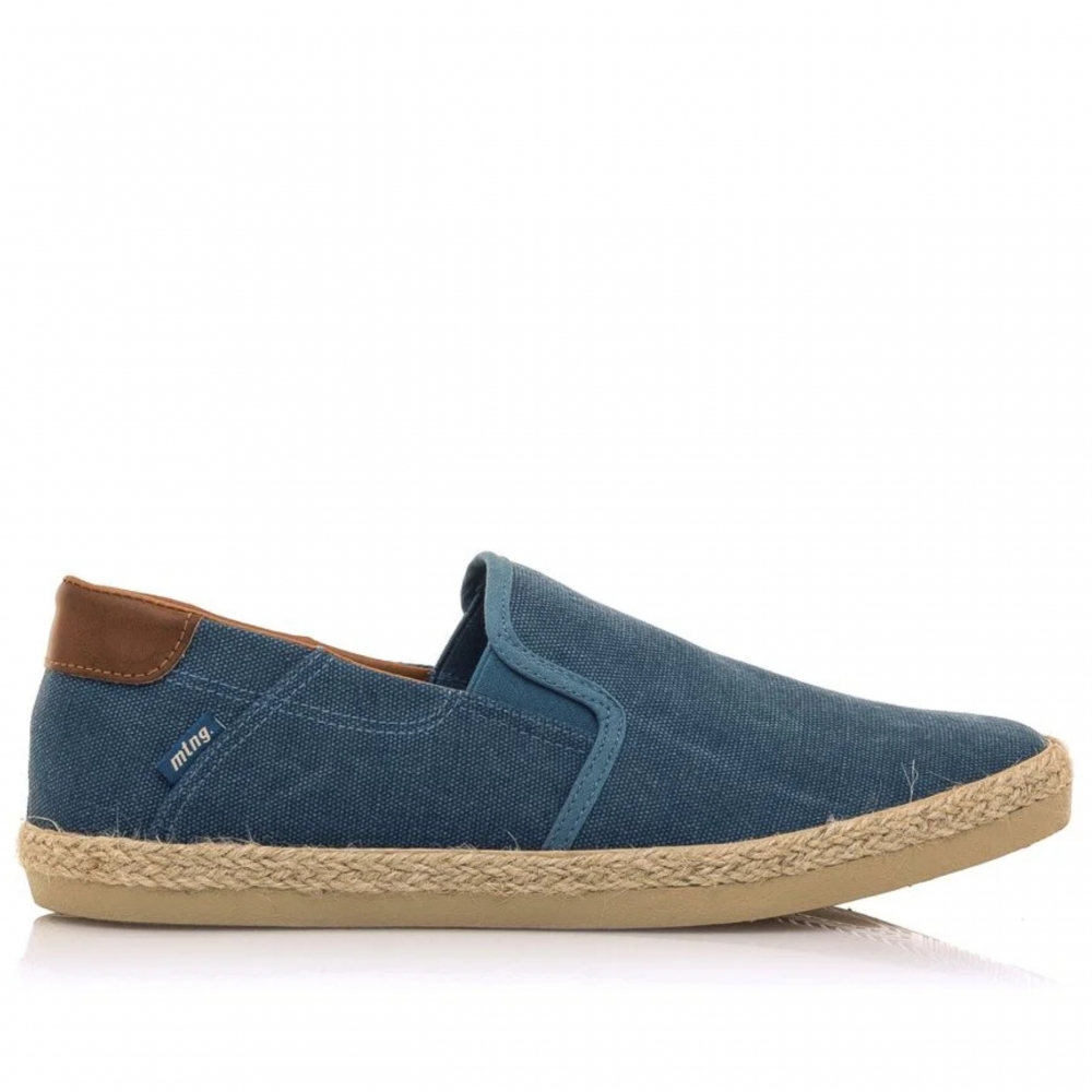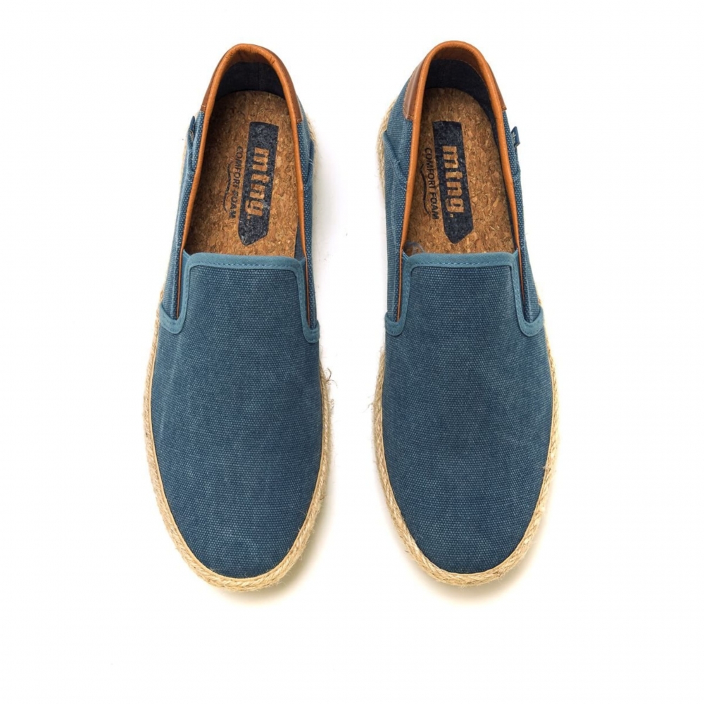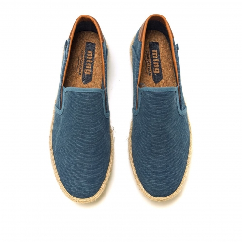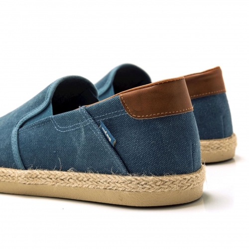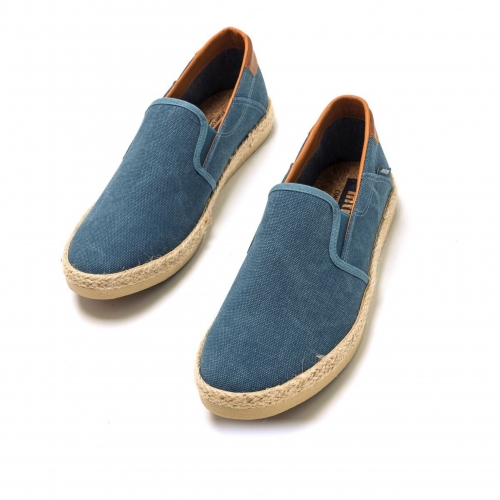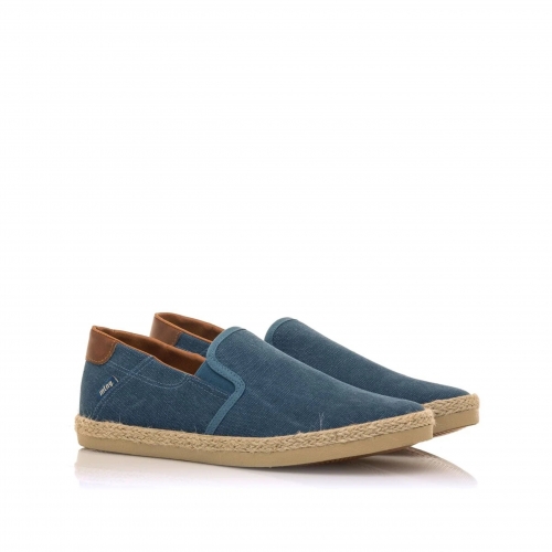 Zapatilla slip-on Bequia Mustang para chico. Diseñada en color azul jeans, presenta sus detalles en color cuero. Suela con detalle de tira de yute. Logo de la marca en una etiqueta lateral. Incorpora bandas elásticas en el empeine para mayor ajuste. Te acompañarán allá donde vayas.