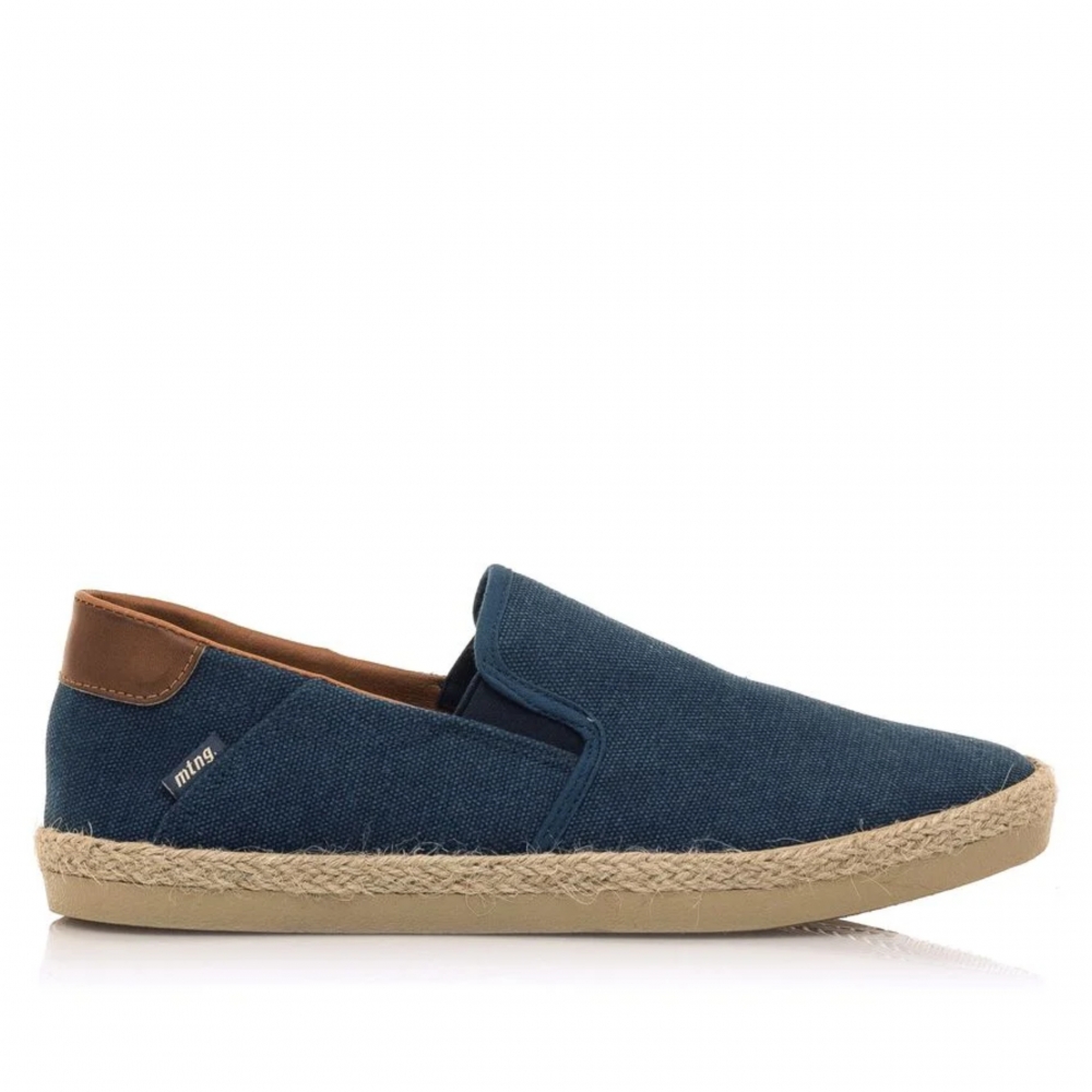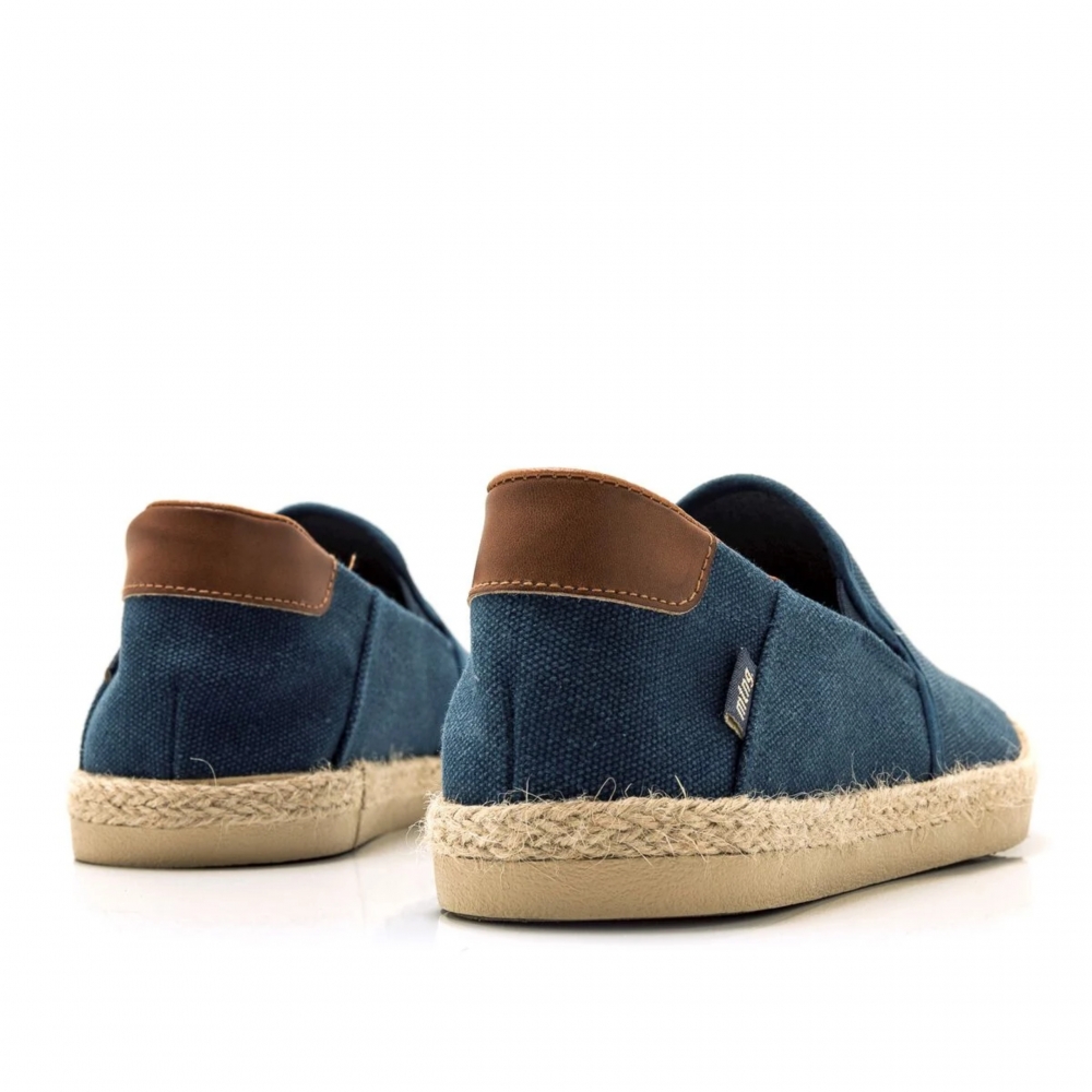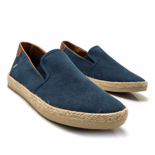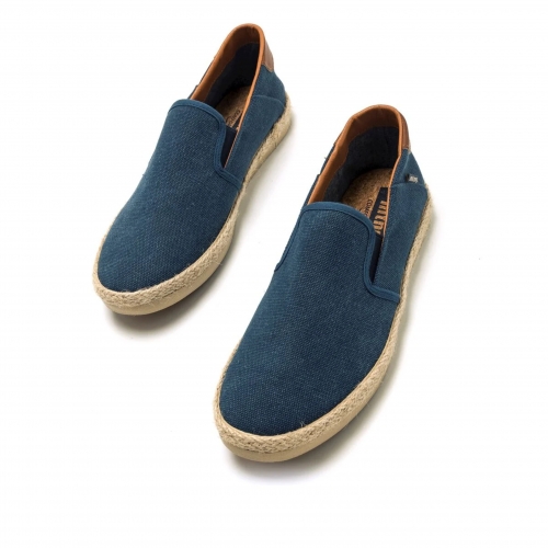 Zapatilla slip-on Bequia Mustang para chico. Diseñada en color azul jeans, presenta sus detalles en color cuero. Suela con detalle de tira de yute. Logo de la marca en una etiqueta lateral. Incorpora bandas elásticas en el empeine para mayor ajuste. Te acompañarán allá donde vayas.
