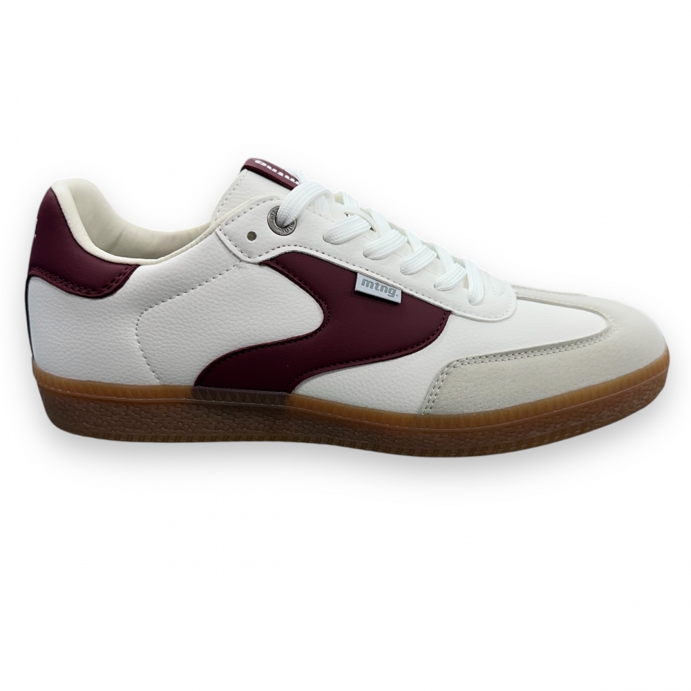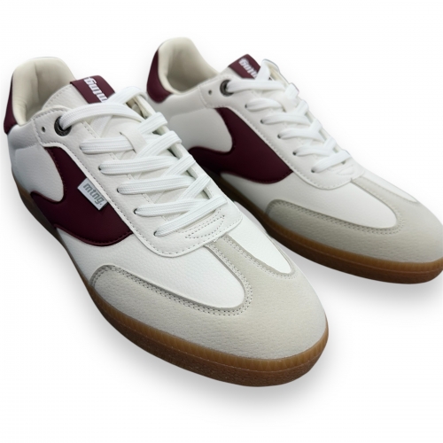 Zapatillas blancas Nova de hombre, marca Mustang. Estas zapatillas bajas tienen un diseño clásico. El contraste entre el blanco y el burdeos en sus detalles laterales y la zona del talón añade un toque elegante, mientras que la suela de goma en color caramelo relaja su estilo y lo convierte en el calzado ideal para el día a día. ¡Conoce Nova de Mustang!