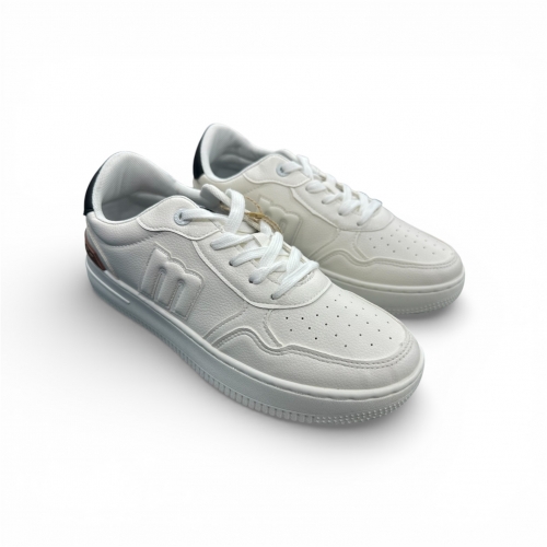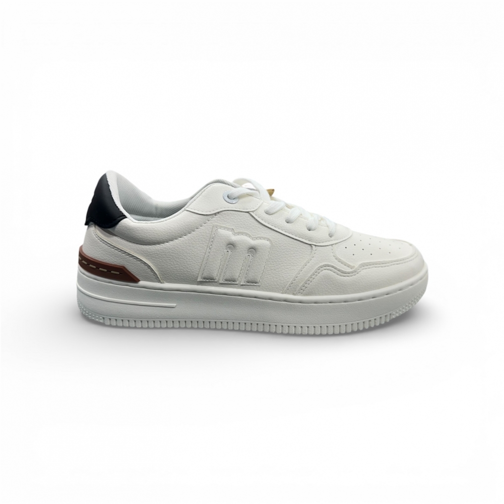 Zapatillas blancas para hombre de la marca Mustang, modelo Gravity, con estilo urbano y diseño de inspiración deportiva. Incluyen detalles en negro y marrón en la parte trasera que aportan contraste sin perder la estética limpia del conjunto. El logo lateral en relieve y la puntera perforada añaden personalidad y funcionalidad al diseño. La suela elevada de color uniforme ofrece una pisada cómoda. Perfectas para quienes buscan un calzado versátil y actual para combinar con looks informales. Con certificado VEGANO sellado por INESCOP, el cual garantiza que la naturaleza química principal del material no se corresponde con fibras de origen animal.