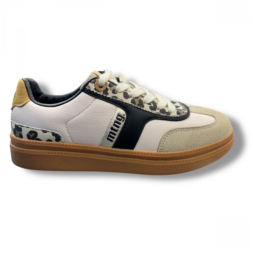 Zapatillas para mujer Cumbia, de Mustang. De color beige. Estas zapatillas destacan por sus detalles negros y de leopardo, aportando un toque atrevido a cualquier look casual. Tienen cierre de cordones y una doble suela, además del logo en el lateral. ¡Atrévete con Cumbia de Mustang!