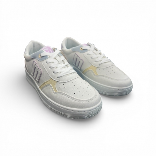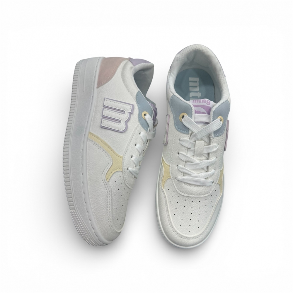 Zapatillas de color blanco para mujer de la marca Mustang, modelo Gravity, de estilo urbano con detalles pastel. Este diseño combina paneles en tonos suaves como lila, rosa, azul y amarillo que aportan un aire fresco y juvenil. La silueta clásica de corte bajo con perforaciones en la puntera favorece la transpiración, mientras que la suela ancha proporciona una pisada cómoda y estable. Cierre de cordones y acabado acolchado para mayor confort. Perfectas para añadir un toque de color a looks casuales sin perder funcionalidad. Con certificado VEGANO sellado por INESCOP, el cual garantiza que la naturaleza química principal del material no se corresponde con fibras de origen animal.