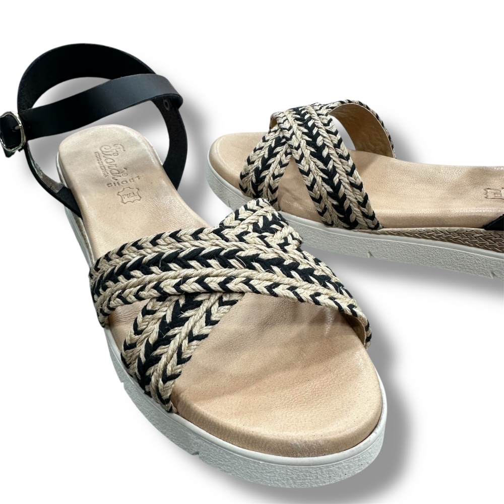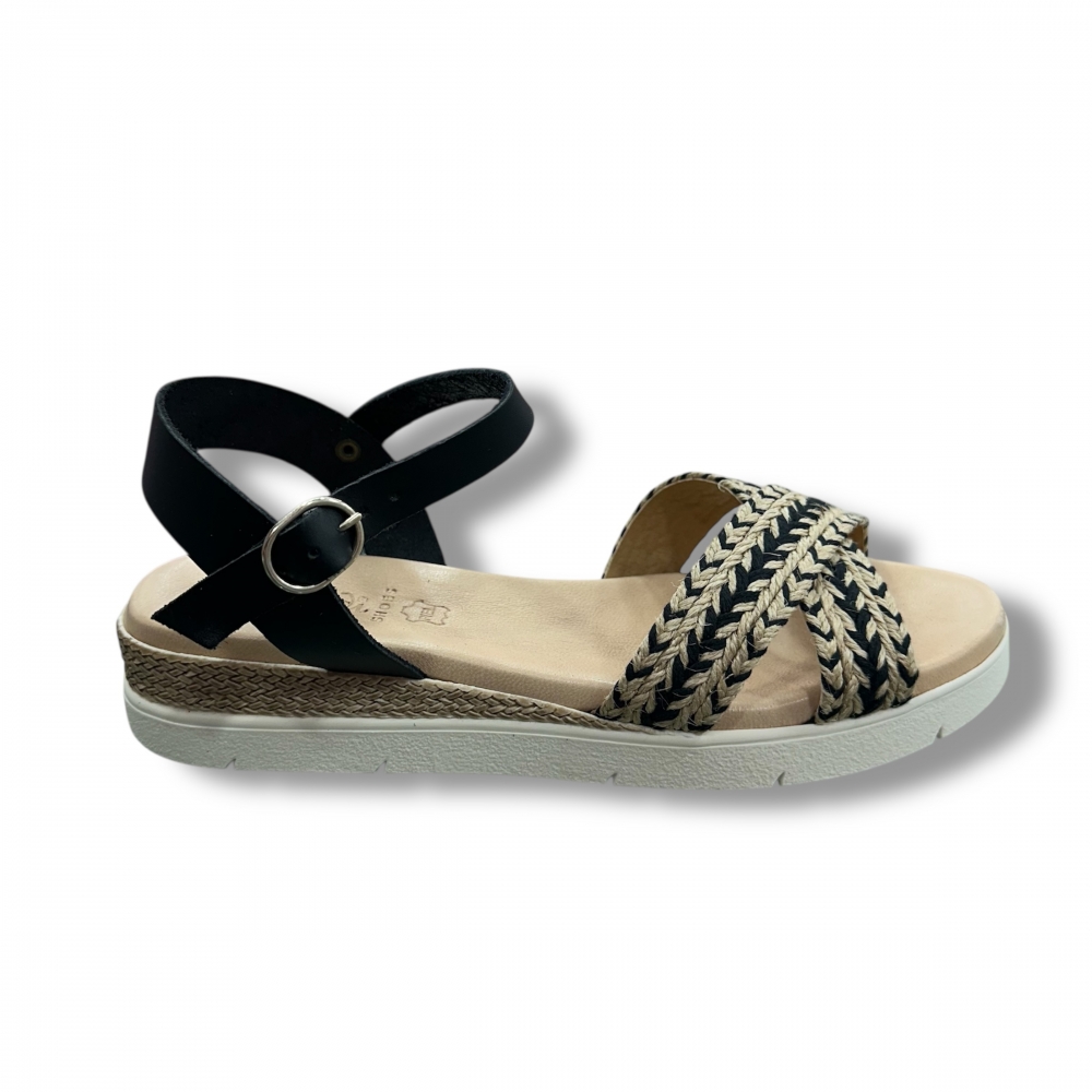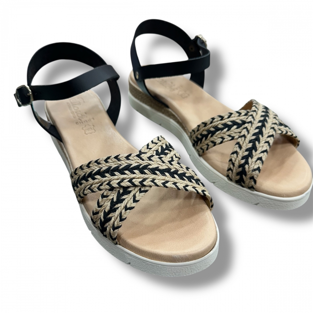 Sandalia en piel natural con acabados étnicos negros y plantilla de piel.