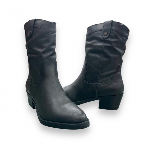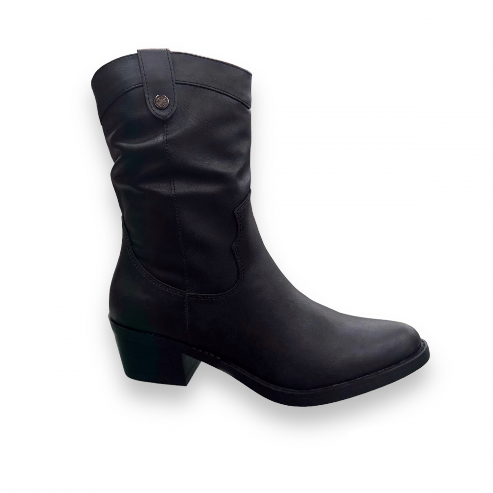 Botín cowboy de mujer, de la marca Refresh. Fabricado en material que imita la piel. Cierre mediante cremallera lateral. Tacón de 5 cm. Suela de goma antideslizante. Un modelo atemporal que se convertirá en un imprescindible. Este modelo ha obtenido el certificado vegano por la organización mundial PETA (Organización de los derechos de los animales).